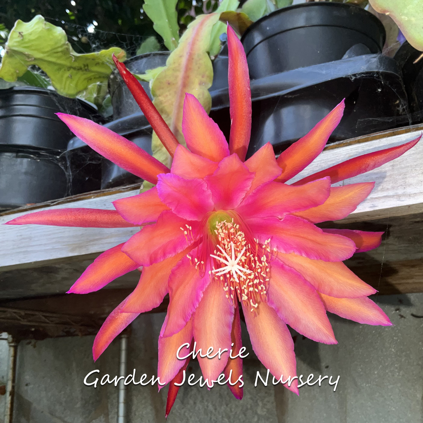 Description: Cherie’s epi plant has a crimson center. Yellow/Tan petals with crimson edges. Back petals orange with purple edges. Medium-Small.