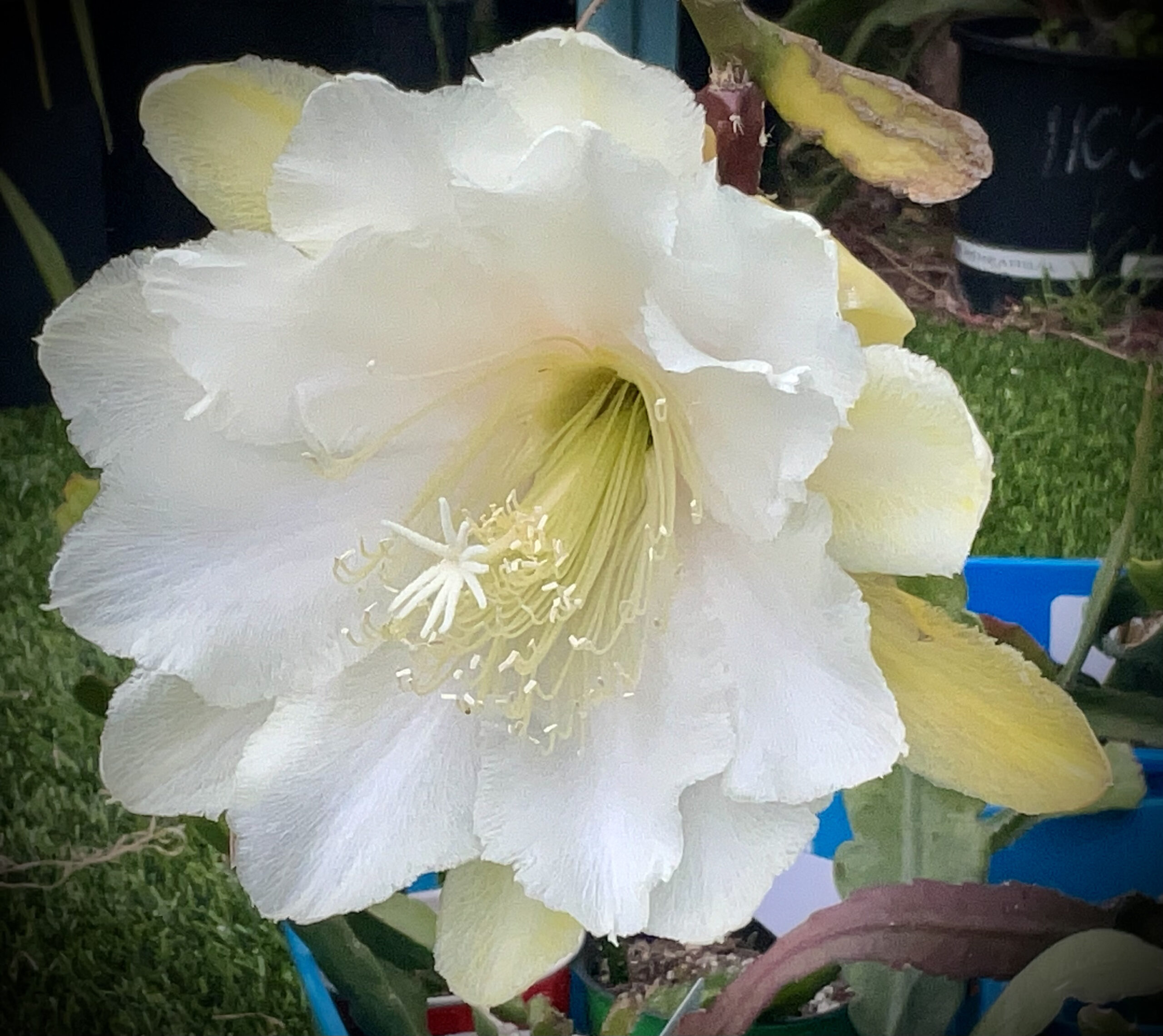 1959. FOB52AD2B(BHM) White. Outer light yellow. Ruffled petals with folded tips. Wide basket growth. XL. ‘Madonna’ x ‘Annie P. Williams’.