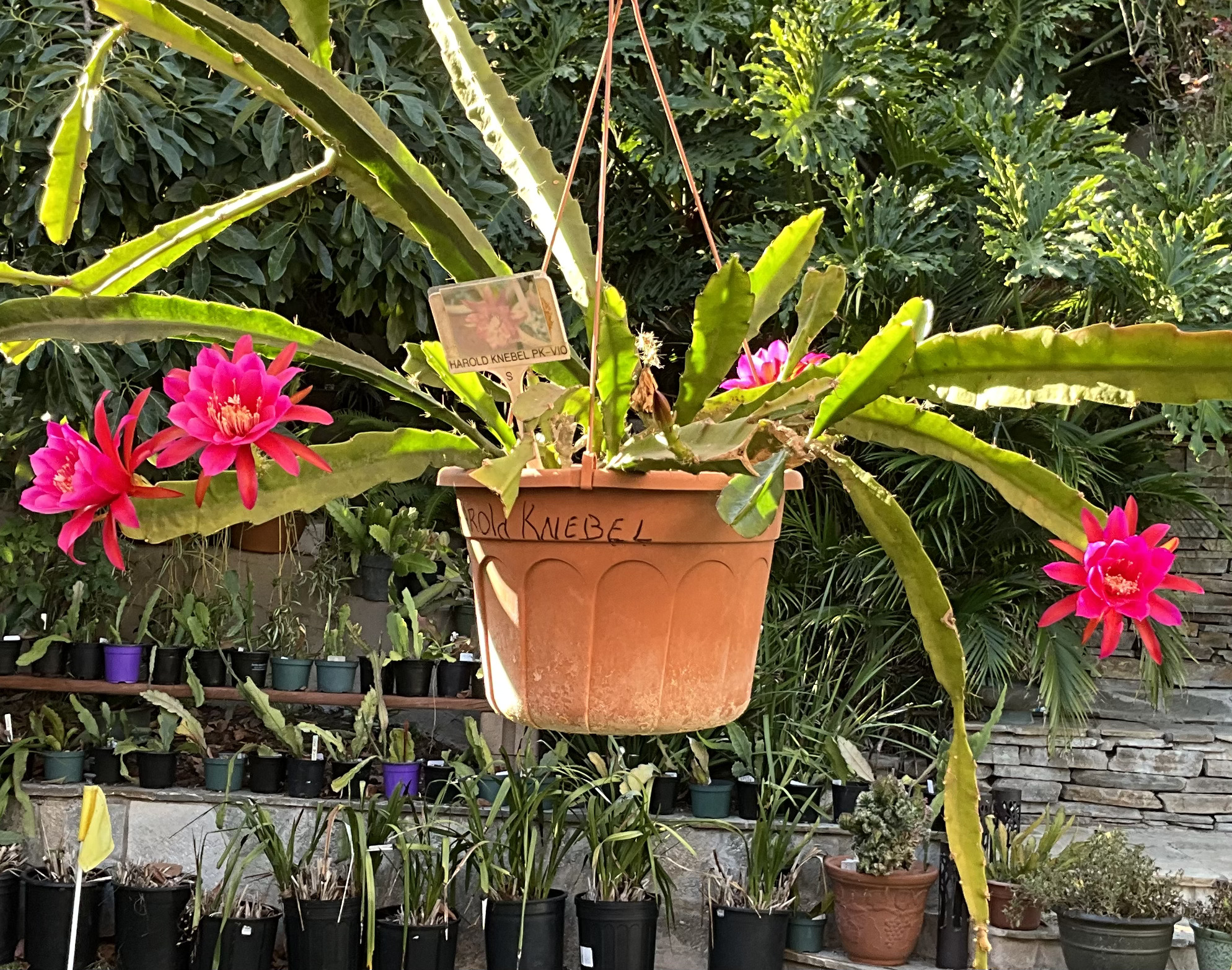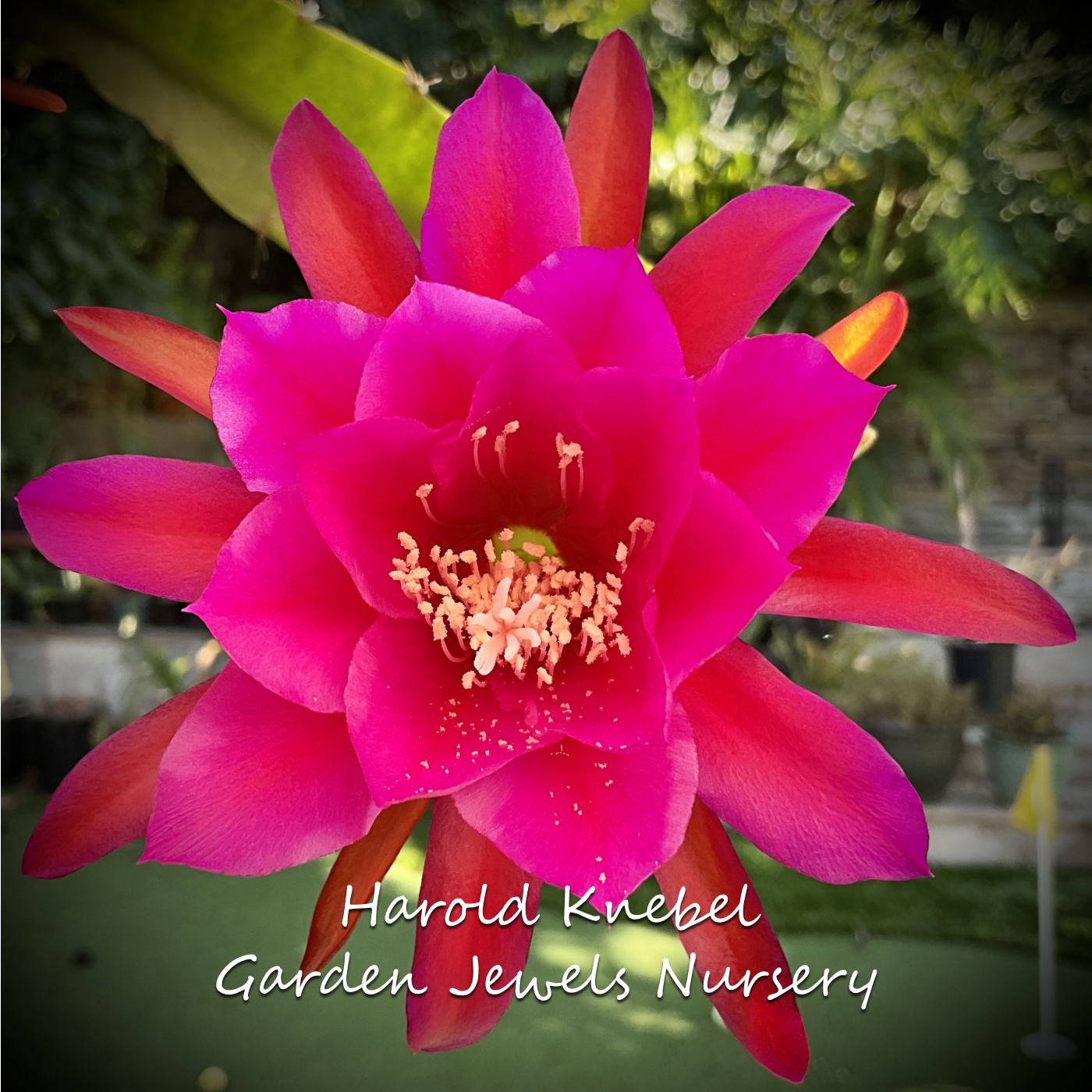 Description: 1935. KN. Dark pink, carmine-violet toward center. Rounded petals. Blooms early and off season. Strong triangular growth. ‘Disocactus speciosus ssp cinnabarinus x ‘Gertrud Knebel’.