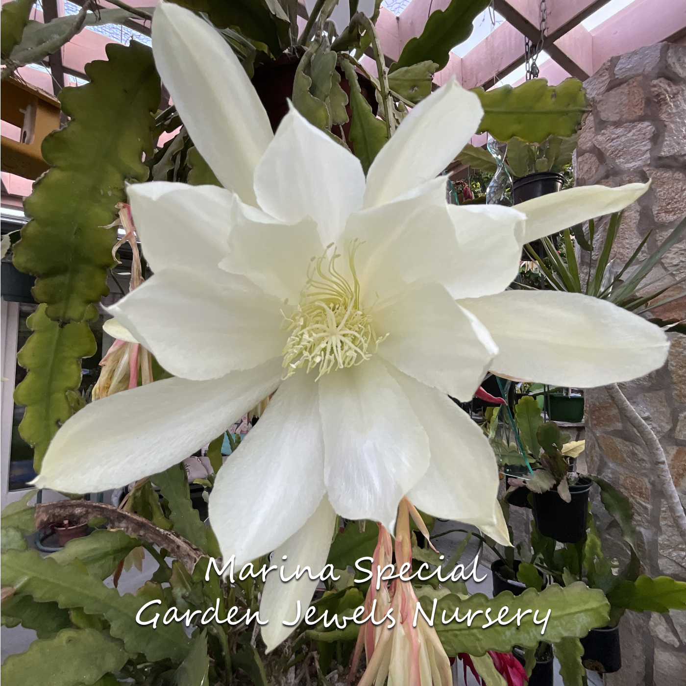 Description: Extra large bloom with white and touches of yellow. An oldie from 1943, seed imported from Germany. Flat basket growth, a strong grower and good bloomer.