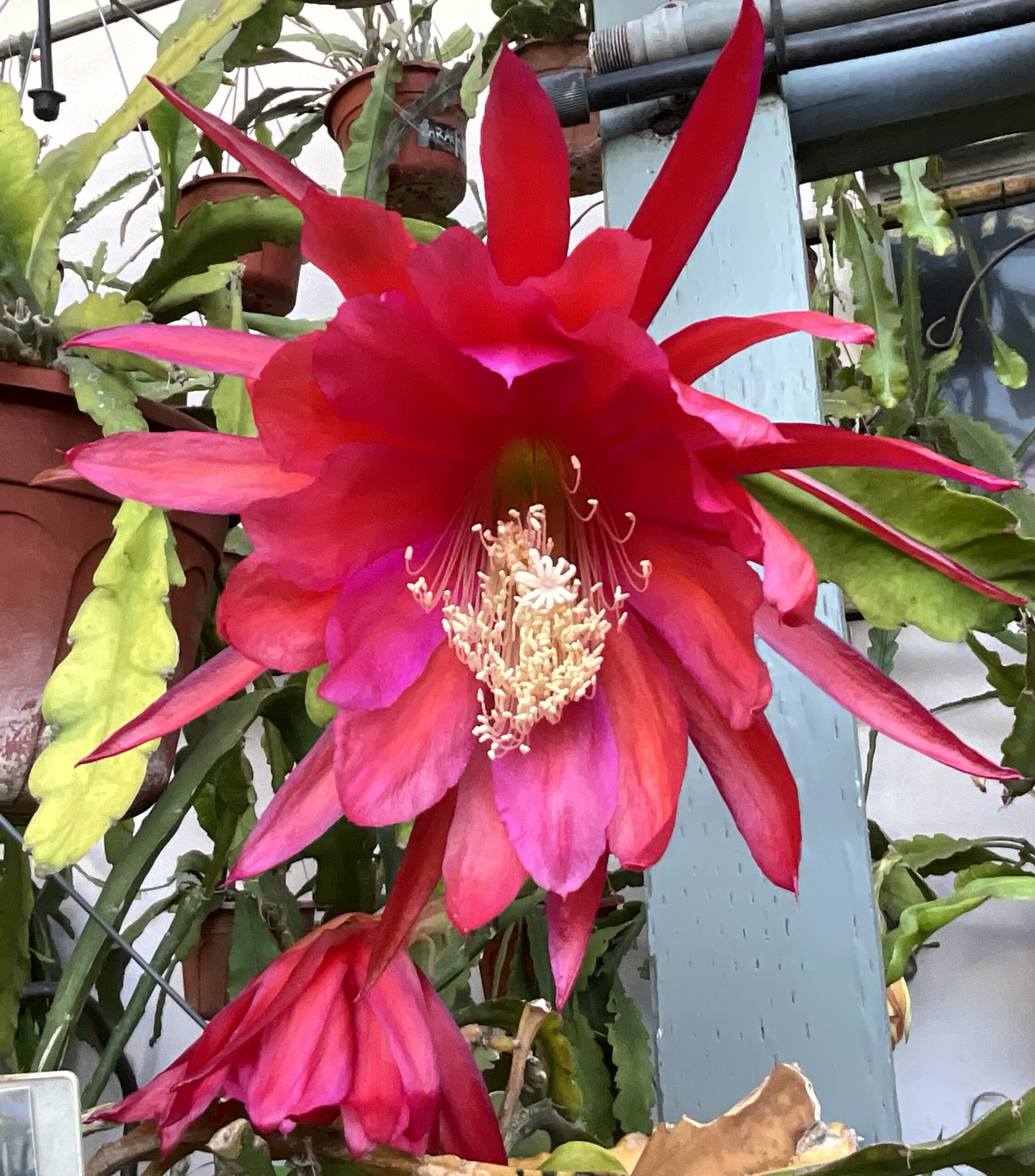 Description: 1982 Fre. Red, fuchsia purple edge. Outer currant red. Overlapping, opens wide. Thick growth. Tele x Jennifer Ann.