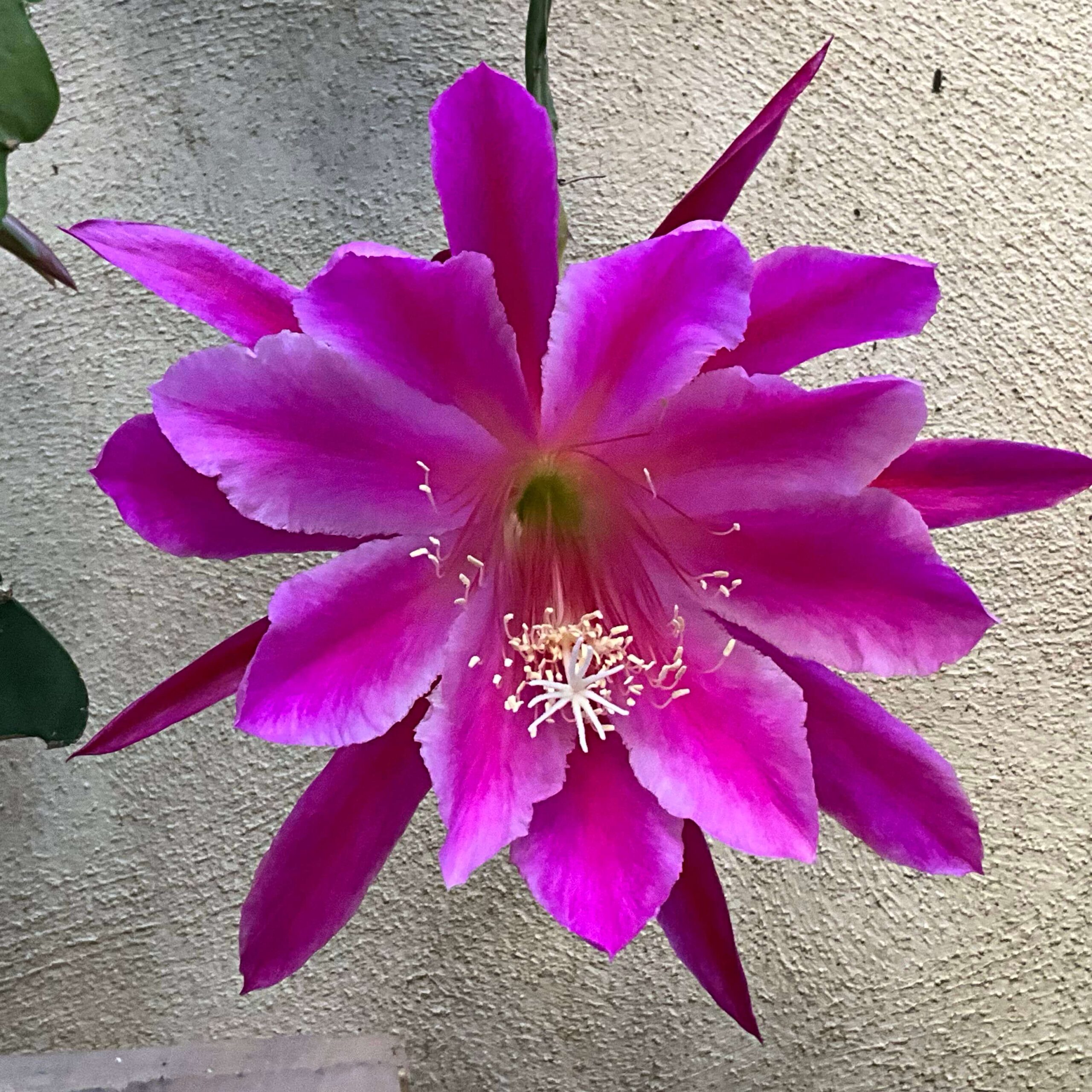 Description: 1957. Solferino purple with lighter edge. Outer petals dark red with lighter midstripe. Open funnel form. ‘Cattleya’ x ‘Augusta von Szombathy’.